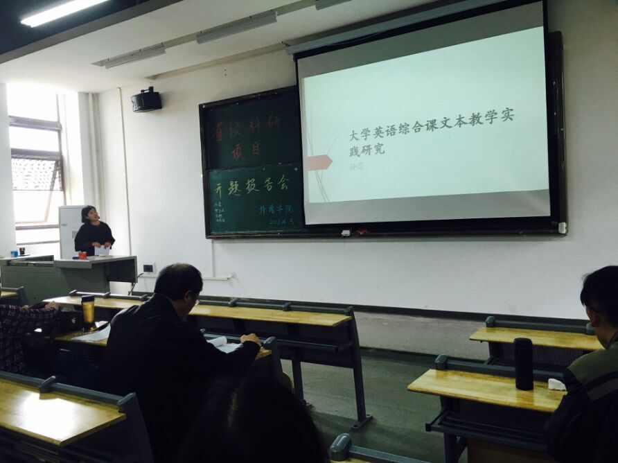 2017年4月5日下午外国语言文学学院在教一101举行省级项目开题报告会,院长任晓晋教授、英语系主任胡孝申教授和商务英语系何康民教授参加本次会议,分别对四位老师的科研项目进行审核并提出建议。科研处领导莅临指导工作,外国语言文学学院其他专职老师也到场观摩学习。