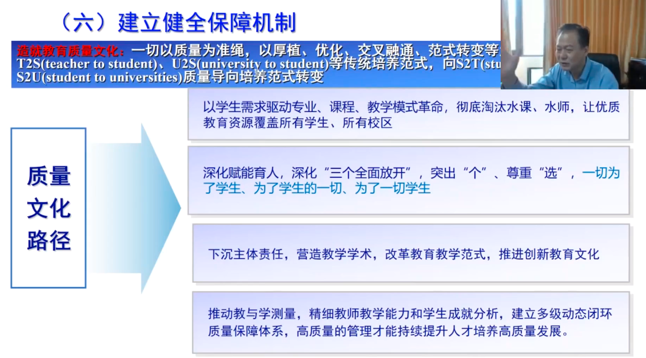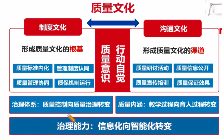 再提出从质量文化角度来解决问题。他认为质量文化是持续提升教育教学质量的最持久、最深沉的力量,学校努力建立自觉、自省、自律、自查、自纠的质量文化,将质量价值观落实到教学各环节,将质量要求内化为全校师生的共同价值追求和行为。