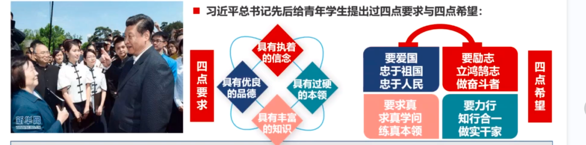 张教授引用了《中国教育现代化2035》的八大基本理念:更加注重以德为先、更加注重因材施教、更加注重全面发展、更加注重知行合一、更加注重面向人人、更加注重融合发展、更加注重终身学习、更加注重共建共享;引用了习近平总书记对青年提出的要求,如下图: