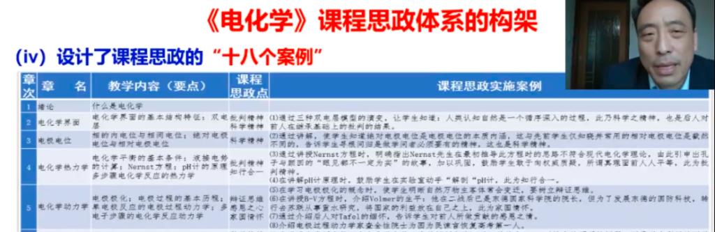(一)胡吉明教授在报告《新时代本科教育发展及人才培养趋势》举了一个他自己做过的一门课程《电化学》,在课程中对课程思政体系的构建,渗透“课程思政”。