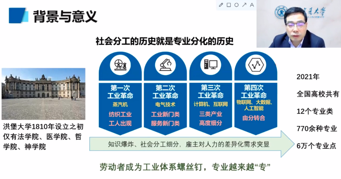 (二)西安交通大学王秋旺教授在报告《西安交大新工科专业建设的探索与实践》中对社会分工中四次工业革命进行了论述,提出了2021年国家对高校开展专业建设的具体要求,全国高校共有12个专业类、770余种专业、6万个专业点。