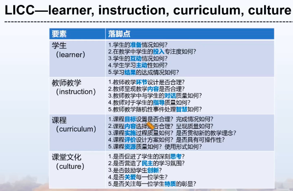 这个课堂评价是我第一次接触到,这个方法可以说是一个可以落实的评价模式,从学生、教师教学、课程、课堂文化四个方面来设计落脚点。