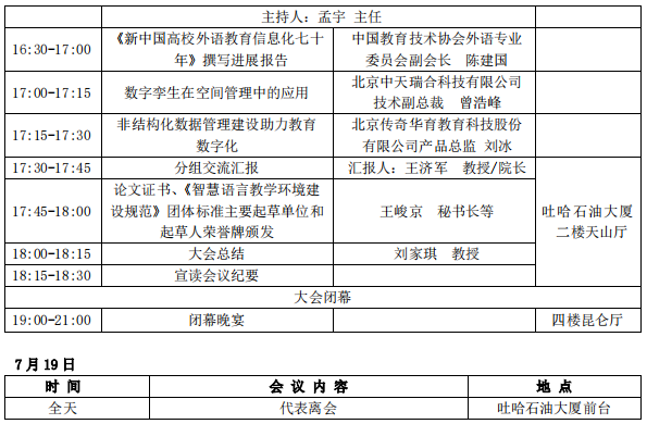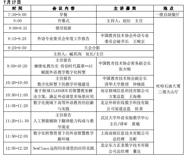 会议开幕式于7月17日上午举行,中国教育技术协会常务副会长张少刚教授、昌吉学院党委副书记逯社教分别致辞。中国教育技术协会外语专业委员会秘书长王峻京向大会做了工作报告,总结回顾了协会近些年的工作,展望了未来外语教育信息化发展。