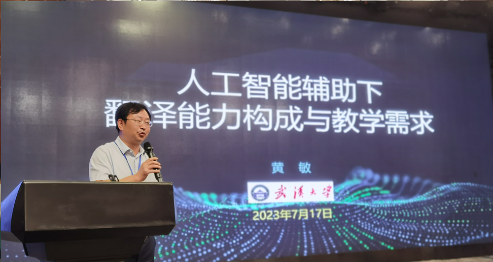 武汉大学外语实验教学中心主任黄敏教授做了题为《人工智能辅助下翻译能力构成与教学需求》的报告,生动讲解了人工智能对外语教学和翻译人才培养的挑战和影响,提出AI辅助翻译能力构成模型和智能语言学习环境的功能需求。