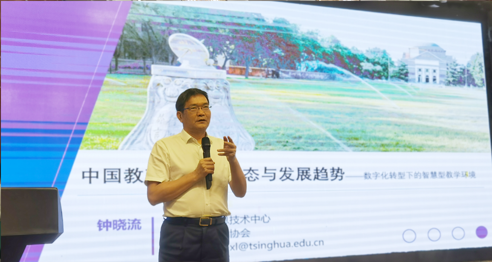 中国教育技术协会副会长钟晓流教授做了题为《中国教育信息化动态与发展——数字化转型下的智慧型教学环境》的主旨报告,报告以人工智能为背景,解读政策驱动下的新基建与数字化转型发展特征。教育数字化如何促进教学创新、提高教学效率,重构服务流程,并对智能教学环境建设做了指导性解读。
