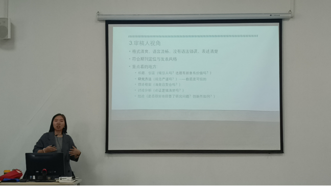 洪敏副教授是英文论文写作领域的知名学者,在学术写作方面有着深厚的造诣,并拥有丰富的SSCI期刊论文发表和审稿经验。洪敏副教授从实战角度出发,结合自身经验详细讲解了SSCI期刊的选择、论文选题与写作、投稿流程、审稿意见回复等方面的内容。她还细致入微地示范了英文文献检索和管理,分享了宝贵的论文发表技巧,并针对当前青年学者、教师们常见的痛点提出了解决方案,引发了在场老师们的热烈反响。