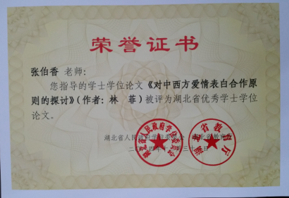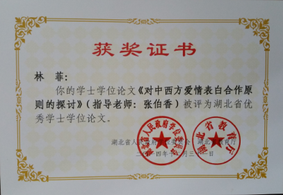 我系2010级学生林菲同学的毕业论文《对中西方爱情表白合作原则的探讨》喜获2014年度全省优秀毕业论文!该生论文指导老师张伯香教授喜获优秀论文指导教师!