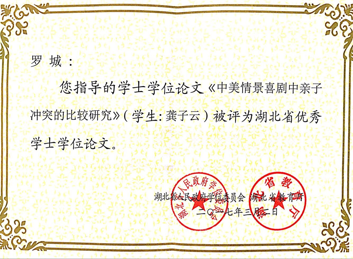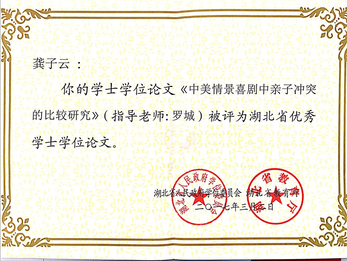 我院英语系2012级学生龚子云同学毕业论文《中美情景喜剧中亲子冲突的比较研究》喜获2016年度湖北省优秀学士学位论文!该生论文指导老师罗城教授喜获省级优秀论文指导教师!(通讯员:陈元晓)