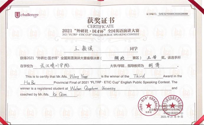 近日,2021年“外研社•国才杯”全国英语演讲大赛省级复赛成绩揭晓,OK138太阳集团英专一班王颖琪同学获得复赛三等奖,指导教师为柯倩。