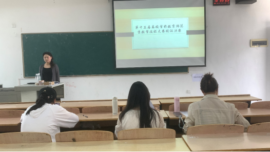 10名参赛选手根据抽签顺序依次上场,分别进行2分钟说课、10分钟模拟授课、3分钟交流答辩,三位评委分别从教学目标、教学内容、教学方法与手段、表达与书写、特色与创新这五个方面对每位同学的现场“无生试讲”教学进行打分。答辩环节评委老师们对选手们的表现给予了肯定,并进行了细致入微的点评与探讨。