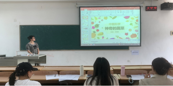 比赛现场,选手们以饱满的热情、流利的语言和富有感染力的表现,将大家带入了一个个生动的教学场景。如学前实验2101班宋文婷开展的中班科学领域活动《神奇的萝卜》,活动围绕切开的蔬菜展开,通过蔬菜切切切的游戏训练幼儿专注力作为导入,通过分组实验探究、讨论验证发现、表格记录和反思小结的主要形式开展活动,利用物体密度与浮力特征,验证了胡萝卜小船浮起来的科学现象。评委老师们一致肯定宋文婷同学的教学设计新颖独特,教学方法灵活多样,有利于培养幼儿对科学实验的兴趣与热爱。