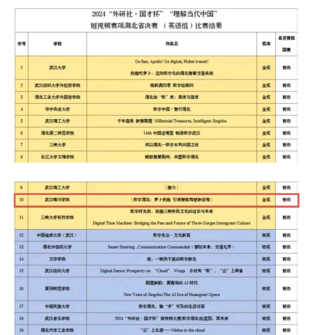 本次大赛鼓励大学生以丰富、生动、鲜活的方式讲述自己及身边的故事,助力新时代大学生以数字化手段赋能国际传播。本次英语组短视频赛项的比赛主题为“数字中国”,经过激烈的角逐和层层筛选,有百余件作品入围英语组决赛,最终11件作品获金奖,21件作品获银奖,还有22件作品获铜奖,共20件作品晋级国赛。计算机学院马骏飞同学,在众多选手中脱颖而出,荣获湖北省决赛(英语组)金奖,排名第10位。