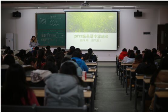 2016.3.9,16:00,武汉大学珞珈学院2013级英语专业的同学们在一号教学楼304召开了搬至新校区的第一次全体大会。13级英语专业的同学们都早早的来到教室,现场座无虚席。