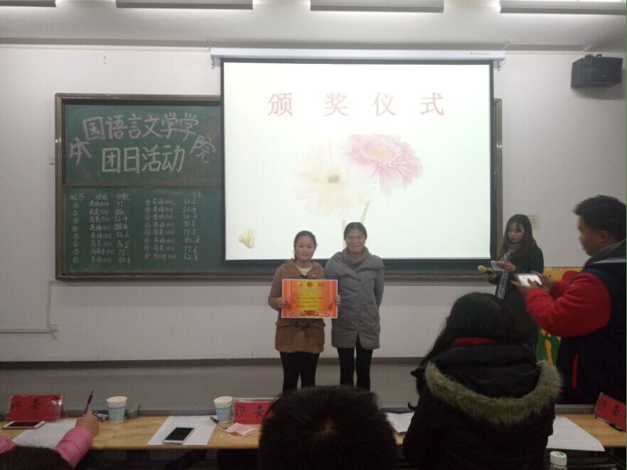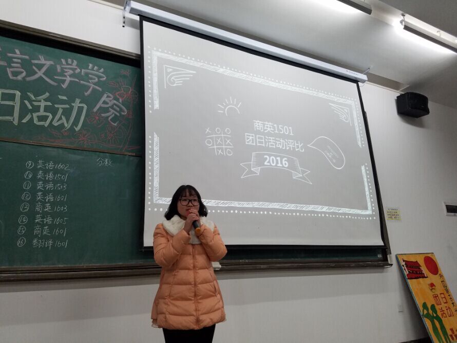 2016年11月23日下午,OK138太阳集团外国语言文学学院于教一109举办了特色团日活动评比大赛。出席此次大赛的有副院长张黎老师、院团委书记张越老师及其他各位辅导员、学生会成员、班级代表、参赛选手等。活动开始,在主持人宣布了本次大赛的评分规则后,各班的团支部书记依次走上讲台,展示了各自班上的团日活动内容,包括团日活动照片,主题班会等。无论是以中国梦还是以争做班级管理者为主题的团日活动都展现了各班同学团结协作、积极向上、创意进取的优良精神。在各班团支部书记或激情、或严谨、或诙谐的展示下,本次活动进入了高潮。伴随着即将出炉的评比结果,现场的氛围紧张起来了。