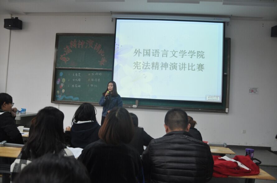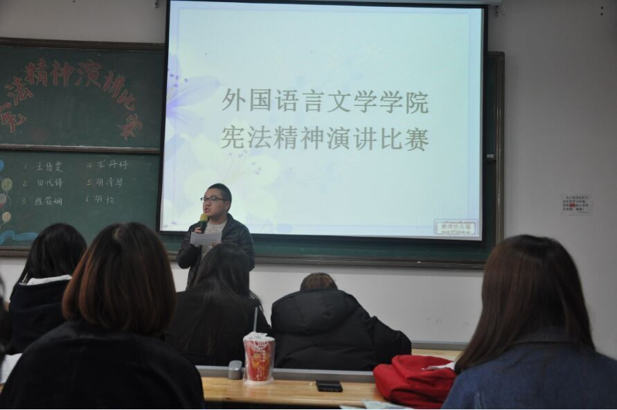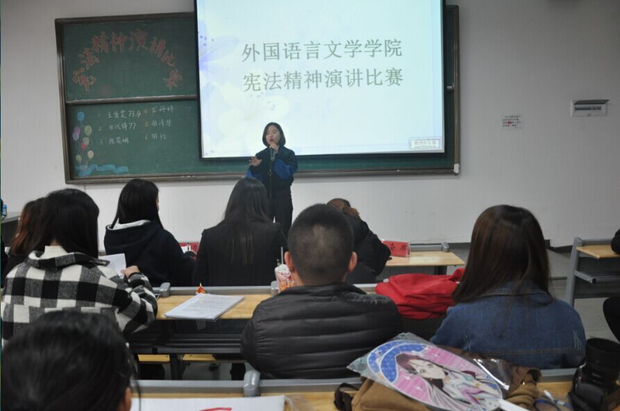 2016年12月7日下午,外语学院在教1-102召开了首届宪法日演讲大赛,出席大赛的有分团委书记张越老师以及学生会全体人员。比赛开始前,张越老师对此次大赛进行了简短的讲话,她希望大家能积极参与,把握机会,在首届宪法日演讲大赛中展现自己。