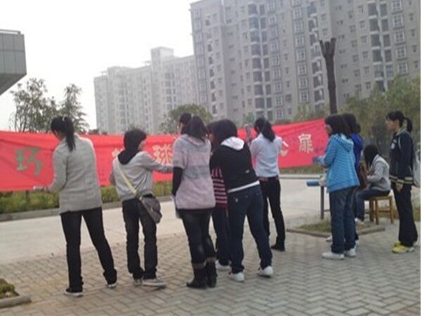 2010年11月3日早上8:30,商务英语1001班与1003班在体育馆旁拉起了横幅,开展了主题为“环抱地球,净在心扉”的团日活动,号召大家一起来保护我们的地球。