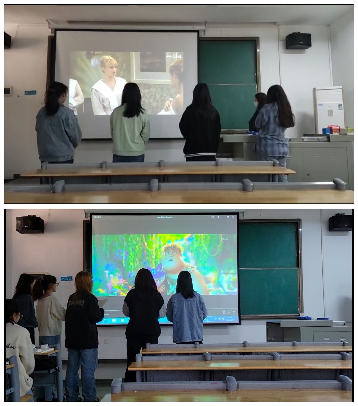 同学们早在约一个月前就开始了自行组队,自由选择配音素材。这堂课将是他们一个月努力的凝结。比赛开始,八个小组依次登场,在选手们进行影片配音的过程中,台下观众都保持安静,每组选手结束配音后老师将会提出建议和表扬并进行评分。参赛小组选取配音影片内容广泛,不少角色配音难度较高,每组选手都尽心尽力融入剧情。观众们在欣赏到精彩电影的同时,也享受了一场听觉上的饕餮盛宴。