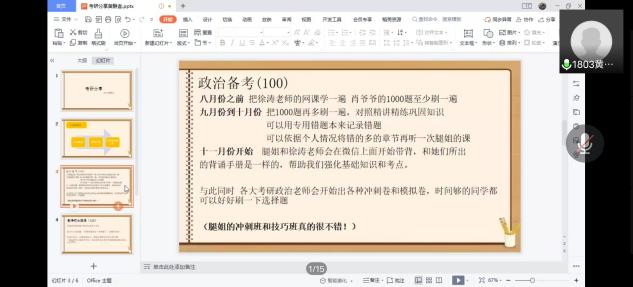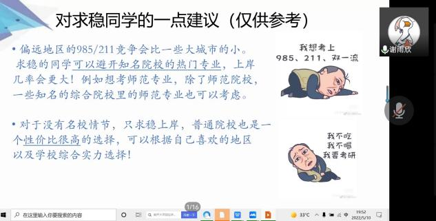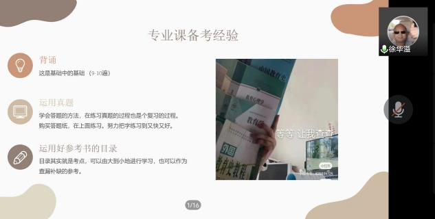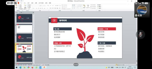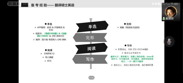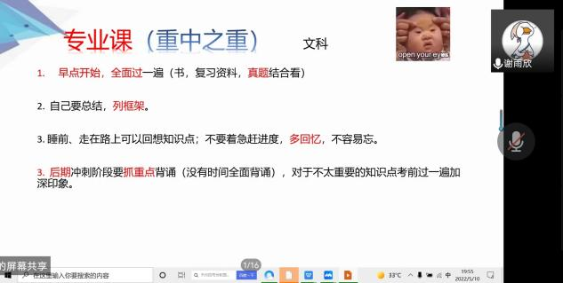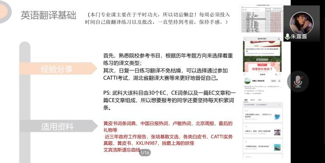 本次会议共有10位考研上岸的2018级同学分享经验,他们分别是:李秋雨(英国诺丁汉大学)、鲁芷汀(华中师范大学)、徐华溢(温州大学),谢雨欣(苏州科技大学)、朱露露(武汉科技大学)、杨勇(湖北大学)、黄静宜(西南石油大学),黄婉玲(上海大学)、胡晓琴(扬州大学)、樊美琪(南开大学)