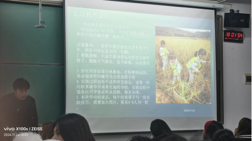 接下来余意老师讲了劳动教育,引导同学们树立正确劳动观念,提升职业素养。并详细讲解了劳动在职业发展中的重要性,包括不同职业领域对劳动技能与态度的要求,以及劳动如何塑造个人职业品格。并重点说明在下周一(11.25)日进行校外劳动实践活动和相关要求。以及同学们要在知到app上学习《劳动教育》(第二课堂必修课)课程,课程在线学习时间:2024年11月19日-2025年3月28日