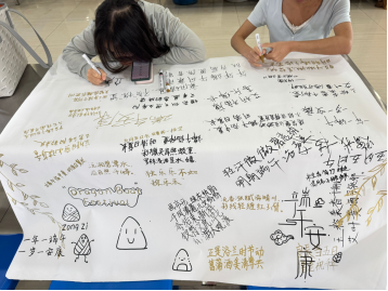 活动在“诗意端午·雅韵传情”环节中拉开帷幕,大家在空白宣纸上认真书写屈原《离骚》“路漫漫其修远兮,吾将上下而求索”等与端午相关的诗词,主持人深情朗诵,带领大家重温诗词中的端午情怀。随后是抽奖环节,象征驱邪避瘟的香包与寓意驱散病邪的艾草锤不仅是奖品,更直观传递了端午“驱虫辟邪”的民俗内涵。