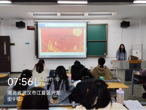 在专题导学环节,团支书卫思晨同学以“全会精神青年学,强国路上勇争先”为题,结合图文并茂的演示文稿,带领大家系统学习了党的二十届四中全会的重大意义与核心要义,让同学们更加清晰认识到自身发展应与国家发展同频共振。