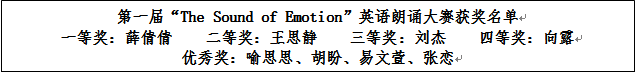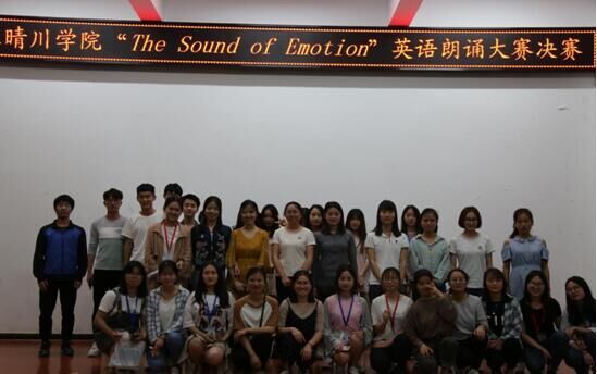 由校团委主办、外语学院分团委承办的第一届 “The Sound of Emotion”英语朗诵大赛,在经过前期的大力宣传,吸引了全校广大英语学习者和爱好者的积极参与。在2018年5月2日的决赛中,我们有幸邀请到学工处副处长刘泽政老师、处长助理田文老师、电机学院分团委书记张丽芳老师、外院分团委书记张越老师以及外院辅导员李晓嫚、刘凯老师担任此次大赛的嘉宾,由外语学院孙灵、董文、程真、毛前平等老师担任评委。