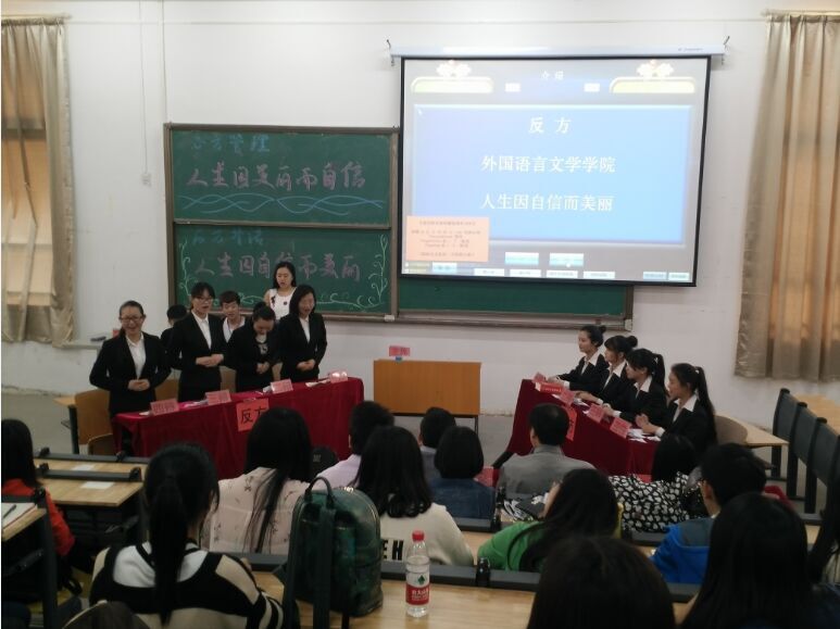 这场比赛的烽火由外国语言文学学院与经济学院点燃。此次比赛的辩题是人生因美丽而自信还是人生因自信而美丽。继双方慷慨激昂、充满理性色彩的自我介绍后,比赛进入开篇立论环节。正方管理学院一辩从美丽的各个表现方面为切入点,用通俗幽默的快板式语言陈述己方“人生因美丽而自信”的观点。反方外语学院则从人的自信由何而来出发,进行层层剖析,论证己方“人生因自信而美丽”的观点。在随后的攻辩环节中,双方更是争锋相对、步步紧逼,现场气氛迅速升温,达到白热化阶段。正反双方辩手清晰的思路和巧妙的陈词更是给观众留下了深刻印象。