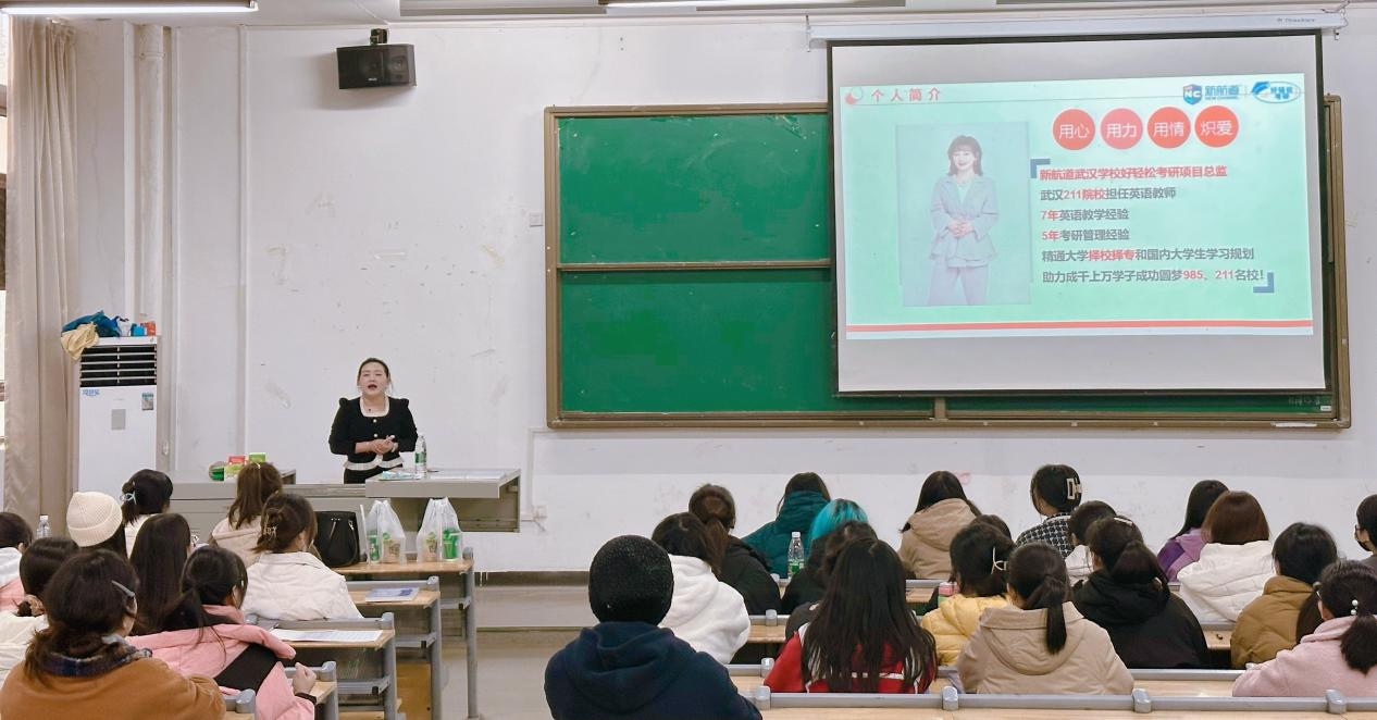 分析完这五个方向,余敏老师又从“时间段复习计划紊乱”;“内容多抓不住重点”等六个方面分析了考研路上的“拦路虎”以及英语考研的择校问题。在讲座的最后,余敏老师与同学们进行了互动交流,鼓励即将英语考研的同学们要充满信心和勇气。她表示:考研不仅是一次知识考试,更是一次心理素质和毅力的考验。希望同学们能够积极面对挑战,相信自己能够取得成功。会上,余敏也代表新航道,向在座的学弟学妹捐赠了考研指导书籍。