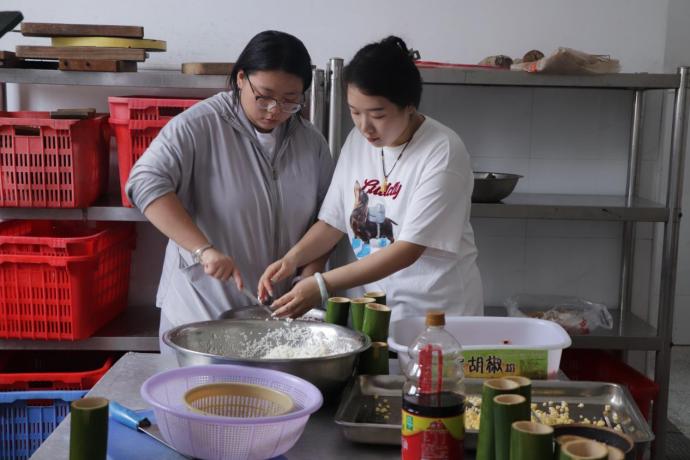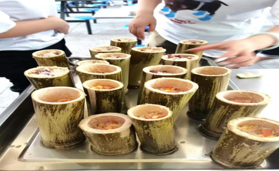 团队成员们熟练且细致地将调配精妙的食材缓缓填入竹筒,并精准地加入适量清水。每一个动作都蕴含着对美食制作的尊重与专注,他们的眼神中不仅流露出对美食的热忱,更饱含着对师生们的深厚关爱。