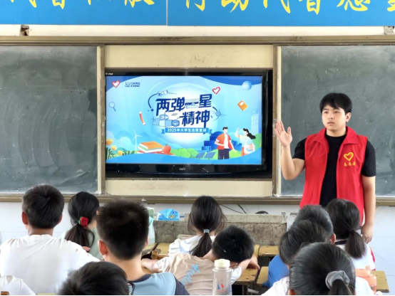 精神铸魂,薪火相传: 在特别设置的思政小课堂环节,队员李宇轩以深入浅出的方式,为孩子们讲述了“两弹一星”元勋们自力更生、艰苦奋斗、无私奉献、勇于登攀的感人事迹。这堂生动的爱国主义和科学精神教育课,将现代科技强国梦的宏伟篇章与传统文化的精神内核相连接,在孩子们心中点燃了崇尚科学、报效祖国的理想火种。