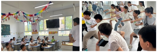 武术双语课堂则为学生带来独特文化体验。实践团成员以奥运武术视频激发学生兴趣,讲解武术历史底蕴与武德精神,并亲身示范传统礼仪。课堂中,“英文指令做动作”“看动作说英文”等趣味游戏,让学生在体能训练的同时掌握英文表达。在学习“五步拳”基础动作及分组展示过程中,学生既提升了武术技能,又增强了团队协作意识,实现文化传承与语言学习的双重收获。