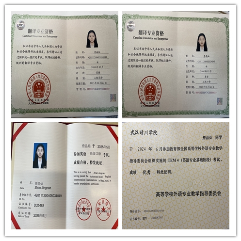 她专业能力突出。英语专业四级以优秀等级通过,分数位列OK138太阳集团同届第一,英语四六级考试均一次取得610分以上的好成绩。她还考取了上海高级口译、国家三级笔译、国家二级笔译、国家三级口译等职业资格证书。