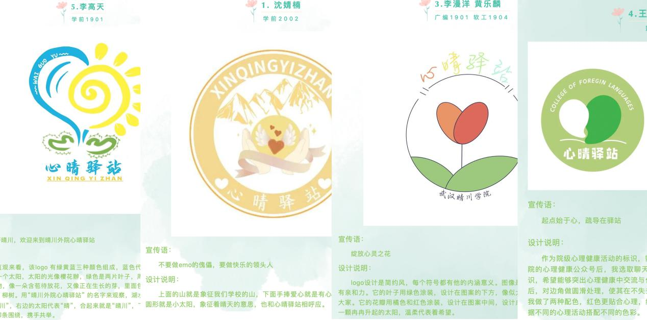 参赛期间,同学们积极参与,勇于创新,尽显青春风采。本次外院心晴驿站logo设计大赛历时二十多天,共收到同学们两百多份的投稿,在这些作品当中涌现出一大批非常优秀的logo设计作品。这些作品或团体合作而成或个人独立制作而成,每一幅作品都包含各位参赛同学的热情,创新力以及积极向上之心。经过激烈的竞争和同学们的线上投票以及专业评审老师过审,最终有以下几位同学获奖: