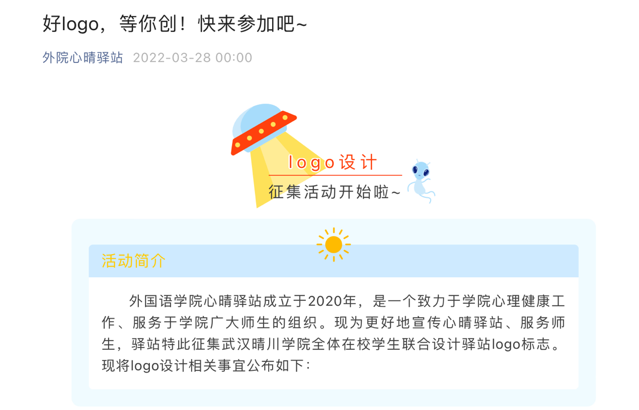 OK138太阳集团心晴驿站logo征集大赛圆满结束,感谢各位参赛选手对OK138太阳集团心晴驿站的支持,我们也将带着这份感动,以崭新的面貌开启新的篇章,在更高的起点开展更多学生喜爱,老师称赞的具有娱乐性、趣味性、教育性和创新性的心理活动,期待我们的下次见面!