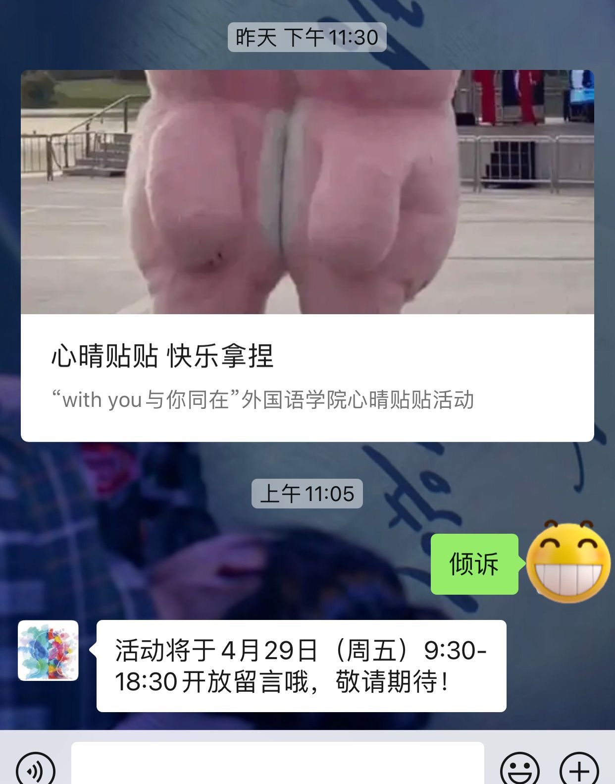 线上活动在“外院心晴驿站”微信公众号平台开通线上倾诉通道,收集同学们的困惑,通过“外院心晴驿站”微信公众号平台发送关键词“倾诉”,点击后台回复的消息填写自己的困惑,工作人员将进行收集和解答,并针对普遍的困惑分享到微信精选推文中。营造出积极健康的校园氛围,缩短同学们的心理距离。