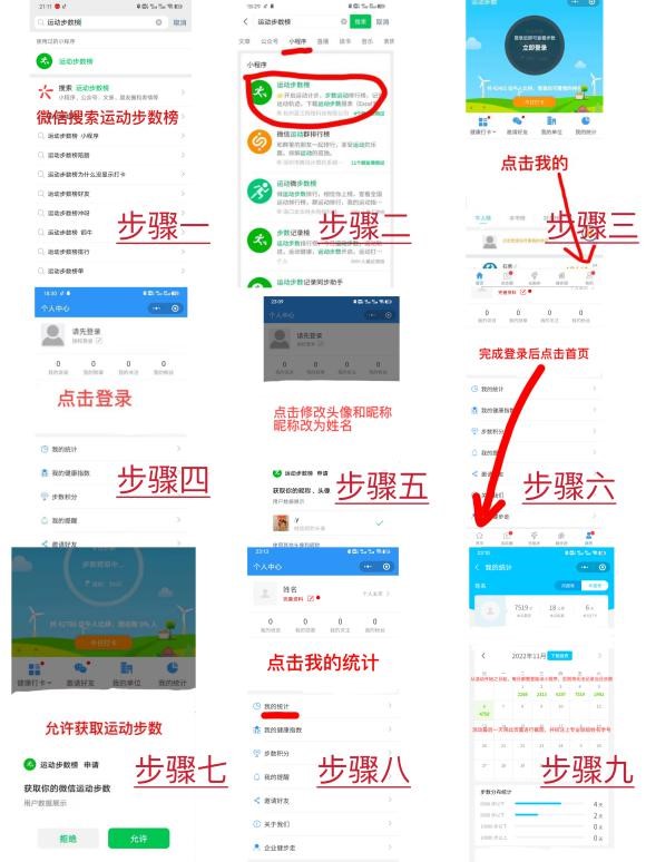 活动规则:微信小程序查找:运动步数榜,完善个人资料(将昵称改为:专业班级+姓名),将个人7天步数统计截图于10月16日22:00前上传至活动群相册,截图上需注明姓名专业班级学号。经工作人员审核后,打卡步数与天数符合要求的同学可获得两个心理课时分,我们还将会在参与活动的同学中抽取六位幸运儿送出一份精美小礼品哦!(具体操作步骤如下图所示)