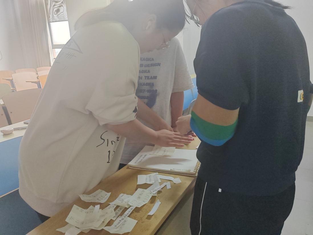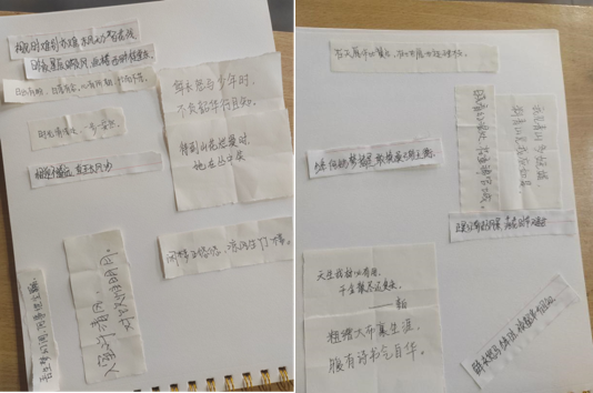 在拼贴诗词的环节中,同学们天马星空,发挥想象,在小纸条上写出自己心仪的词条,并将各自的分散诗句拼贴成了一首首诗歌。正如电影导演一般,大家也充当了一回“诗歌导演”,让看似不搭又零碎的词条化为一体,细细品,也别有一番风味。