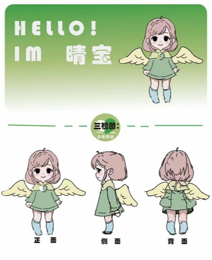 设计理念:该设计的形象是一个可爱的女娃娃。主色调是绿色,代表着驿站的治愈与生敏力。可爱活泼,生动有趣,独特大方。精灵古怪的表情,彰显了晴宝的亲切感与喜感。