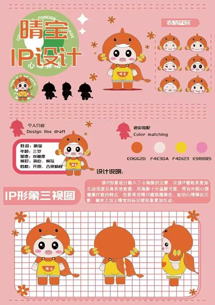设计理念:设计融入了欢快活泼的海豚的元素,使晴宝的形象具有亲近感和喜感。用了与学校教学楼颜色相称的砖红色,明亮的颜色集活泼与治愈于一体。