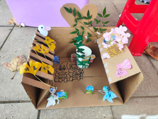 创作灵感:以箱子为框架,构出一种工艺线条美感,坚持环保意识;以落叶当点缀,嗅出秋冬的英姿飒爽,寻找大自然的气息;以纸蝶为美感,流露风中起舞的仙女,含人有种耳目一新的感觉。至于所画,是对创作的热爱,在环创中汲取丰富的创造力,至于所实,是对未来生活的憧憬,让环境保护成为一种风尚。