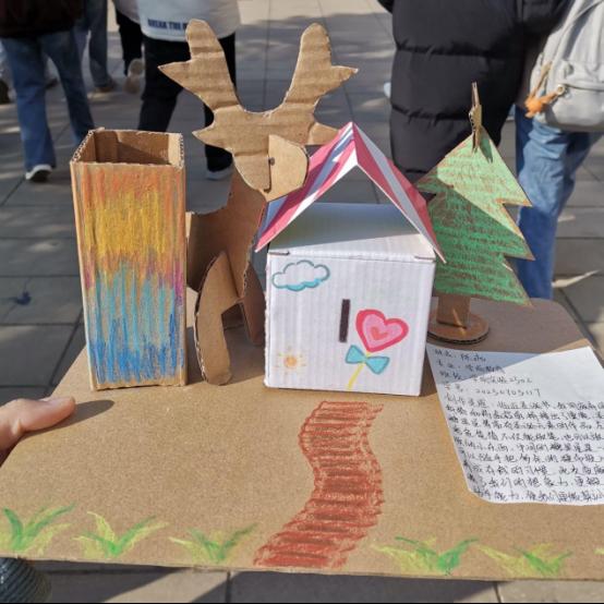 创作灵感:临近圣诞节,我用废弃的快递纸箱和药盒裁剪拼接出了麋鹿、圣诞树,糖果屋等富有圣诞元素的作品,左边的彩色笔筒不仅能放笔,也可以放一次性筷子,收纳小东西。中间的糖果屋是一个零钱罐,可以随手把多余的硬币投入,积少成多,养成存钱的好习惯,此次变废为宝,不仅增强了我们的想象力,更锻炼了我们的动手能力,使我们更能深刻了解环保的意义。