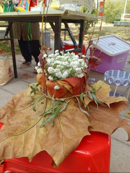 创作灵感:枫叶象征着秋天和变化,它们在秋季变成了美丽的红色或橙色,满天星代表纯洁和清新,用花篮寄托爱与希望,化“腐朽”为“神奇”,在废弃物中寻找美丽和希望。