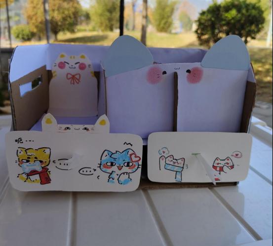 创作灵感:我有很多花笔,小杂物大部分是散装,此外也没有放纸包的东西,因此我就想到用废纸盒做一个收纳盒,并画上自己喜欢的小猫图案。
