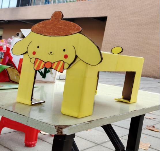 创作灵感:我们家新来了一位小成员,是一只非常可爱的小狗,它的名字叫“拖把”,我很想把它带来学校,所以我就用废弃的纸盒子制作了一只布丁狗,因为布丁狗和拖把一样可爱。