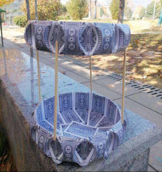 创作灵感:花灯又名“彩灯”,起源自汉代悬挂在厅堂梁上的照明灯具。该作品采用日常被大量使用的一次性筷子与洗脸巾为创作材料,对二者进行组合,实现变废为宝。