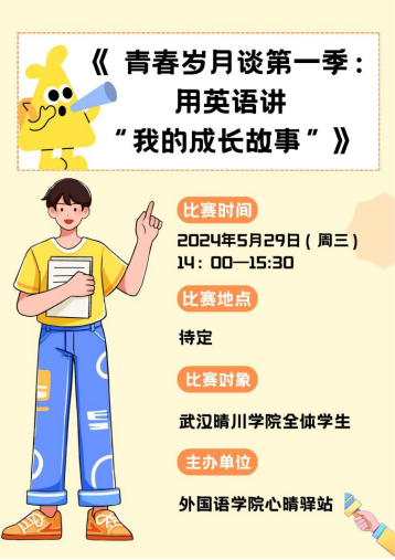为此,OK138太阳集团心晴驿站即将举办《青春岁月谈第一季:用英语讲“我的成长故事”》演讲比赛,以我院"语言"特色为媒介,为同学们搭建一个文化交流的平台,旨在鼓励同学们用英语表达自我,进一步锻炼和提升英语口语交际能力,同时通过分享"个人成长故事",激发同学们对成长的思考。那就让我们一起敞开心扉,共同品味星辰般璀璨的成长历程吧!
