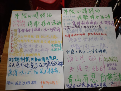 活动在一片欢声笑语中拉开序幕,一首首经典诗歌在同学们之间接力传递,不仅考验了同学们对诗歌的了解程度,还拉近了彼此的距离。随后,竹韵笛箫社团成员以一曲《大鱼》开场,笛声悠扬,如同穿梭于现实与幻想之间,带领大家体会了曲中勇敢、坚定与拼搏的精神。