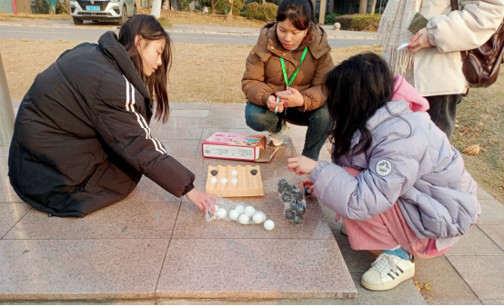 冬季运动会内容丰富多彩,活动伊始,一系列妙趣横生的比赛项目依次展开。率先进行的项目为:乒乓球五子棋。该比赛集趣味性、娱乐性和竞争性于一体,考验着选手的手部敏捷度和观察能力,让参与者在游戏中体验到与同伴一起游戏的快乐。与此同时,操场另一侧的“爱你在心口难开”小游戏也如火如荼地进行着。选手们根据他人指引小心翼翼地做出动作,稍有不慎,一旦触发卡牌上的指令动作,便会遗憾出局。整个游戏过程紧张刺激,充满悬念,被无意淘汰出局的参与者也惹得同伴捧腹大笑。