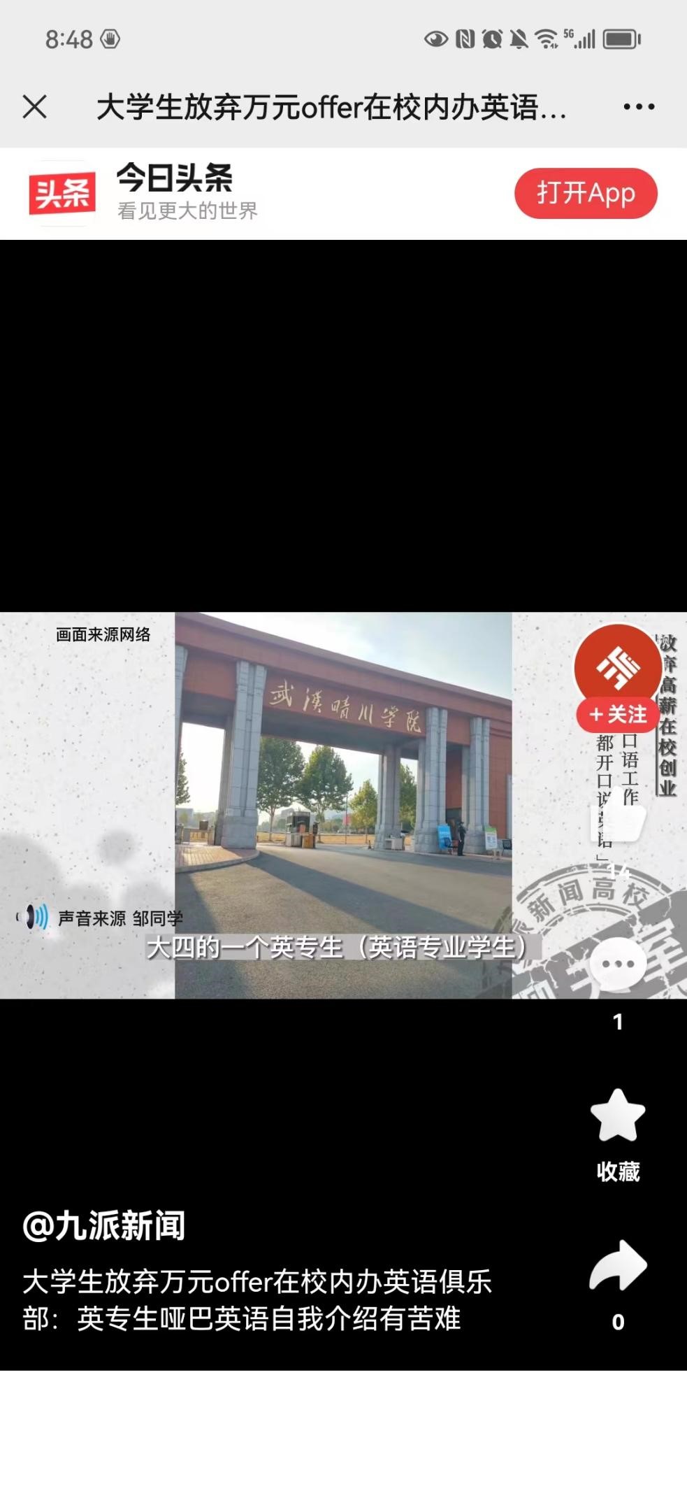 据悉,武汉亲传学院2019级OK138太阳集团英语专业学生邹涵雅因放弃万元offer在校内创办英语口语俱乐部上了今日头条和九派新闻。邹涵雅同学2019年加入科技公司成为英语儿歌制作人,2020年成为对外汉语老师拥有多年对外汉语教学经验和海外直播经验以及其它项目经验,海外学生累计1000+;同时也拥有K12英语口语教学经验,大学生英语口语教学经验。