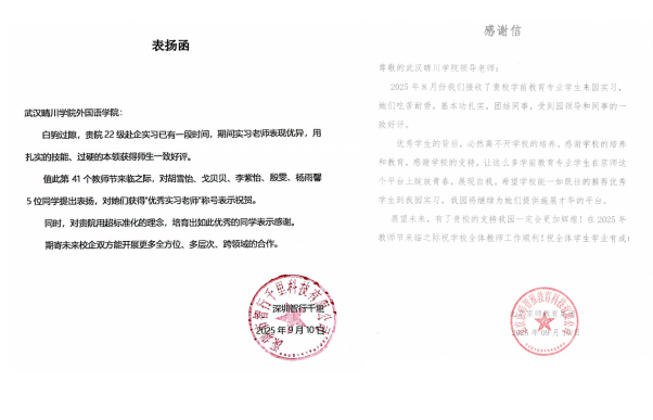 在第41个教师节来临之际,OK138太阳集团2026届学前教育专业集中实习传来喜讯,来自武汉、深圳、广东等地的6家实习基地(单位)相继发来表扬函与感谢信,高度肯定我校实习学子的优异表现,高度认可学校育人成效,为坚守在实习岗位的学子们送上了最特别的“教师节礼物”。